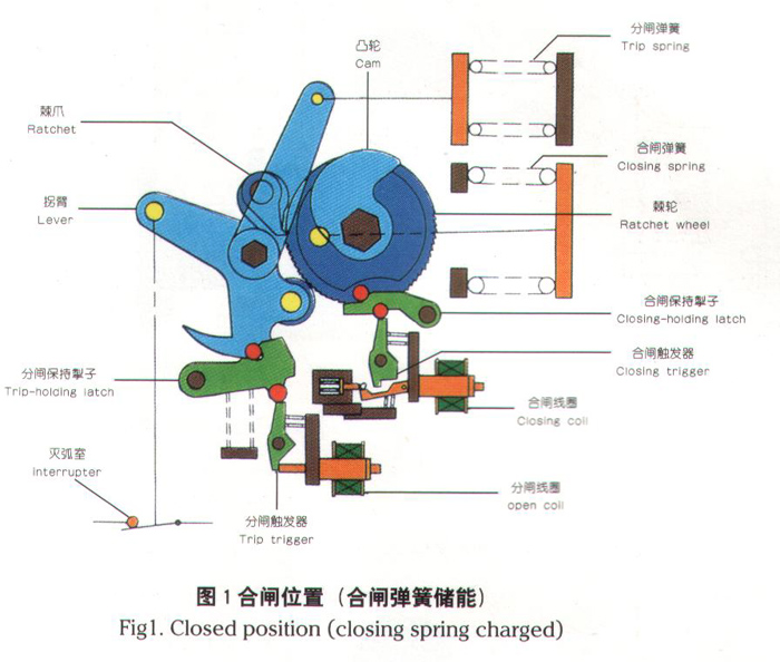 圖1所示狀態為開關處于合閘位置,合閘彈簧已儲能(同時分閘彈簧也已儲能完畢)。此時儲能的分閘彈簧使主拐臂受到偏向分閘位置的力,但在分閘觸發器和分閘保持掣子的作用下將其鎖住,開關保持在合閘位置。
